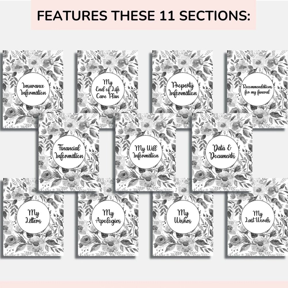 This practical planner is printed in US Letter Size (8.5" x 11") with a durable coil binding and a vibrant matte-finish cover. Inside, its 143 pages of black-and-white interior are thoughtfully organized into clear sections, including: Personal Records & Key Contacts Digital & Document Logins/Locations Insurance, Will & Legal Information Financial Accounts & Property Details End-of-Life Care & Funeral Wishes Letters, Apologies & Last Words