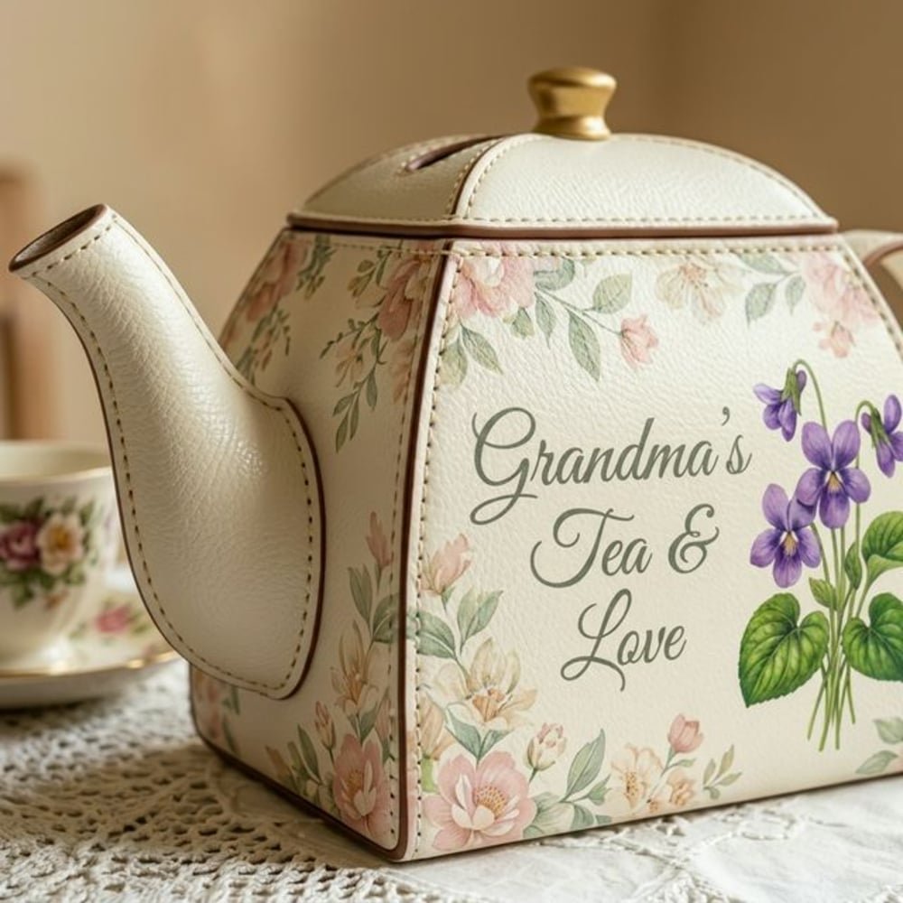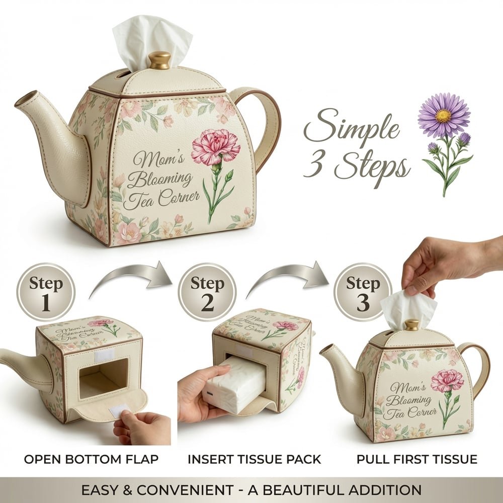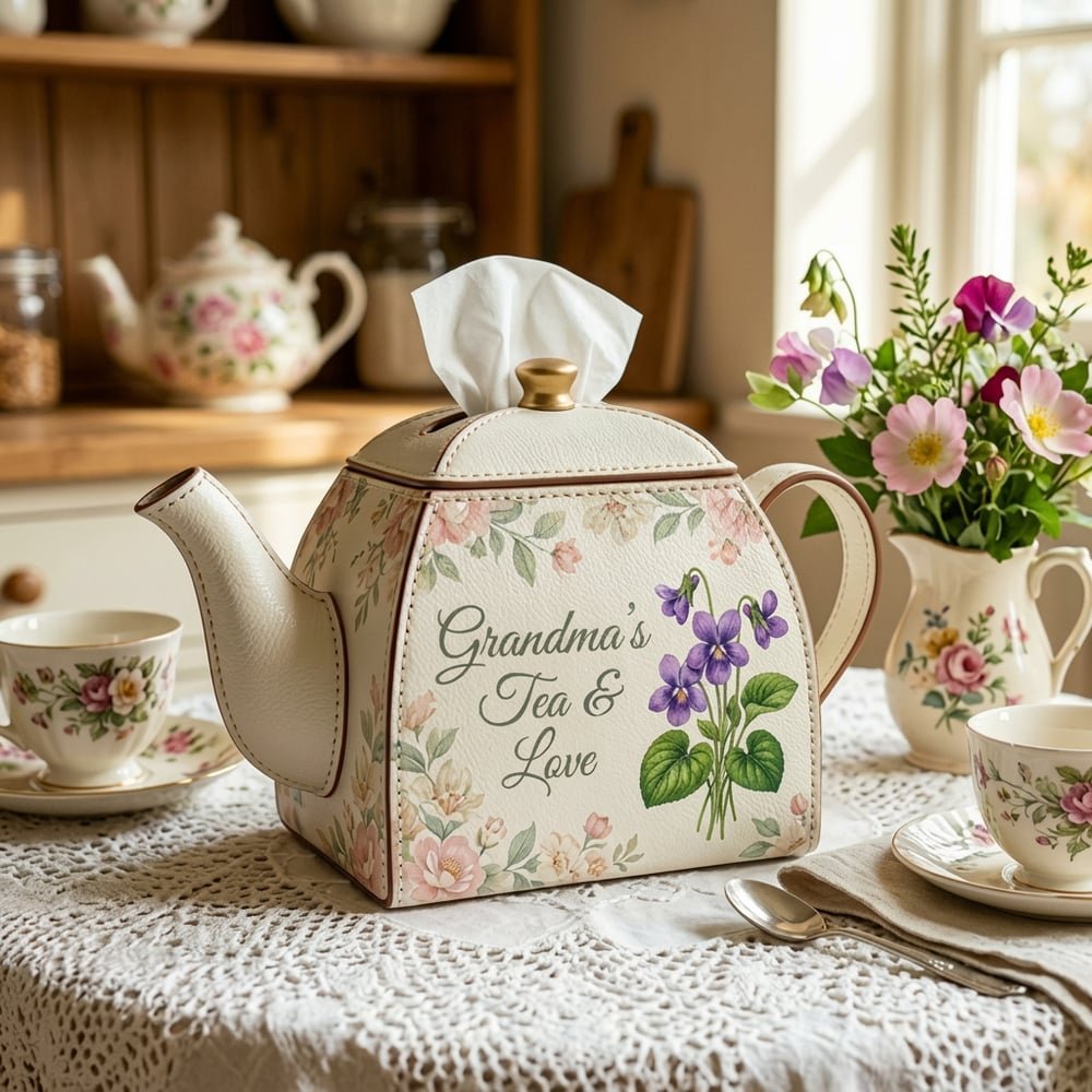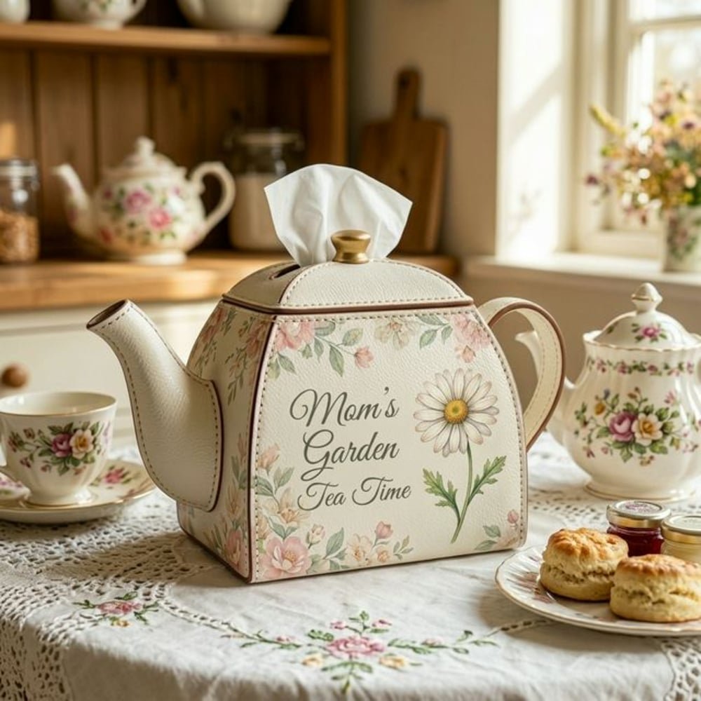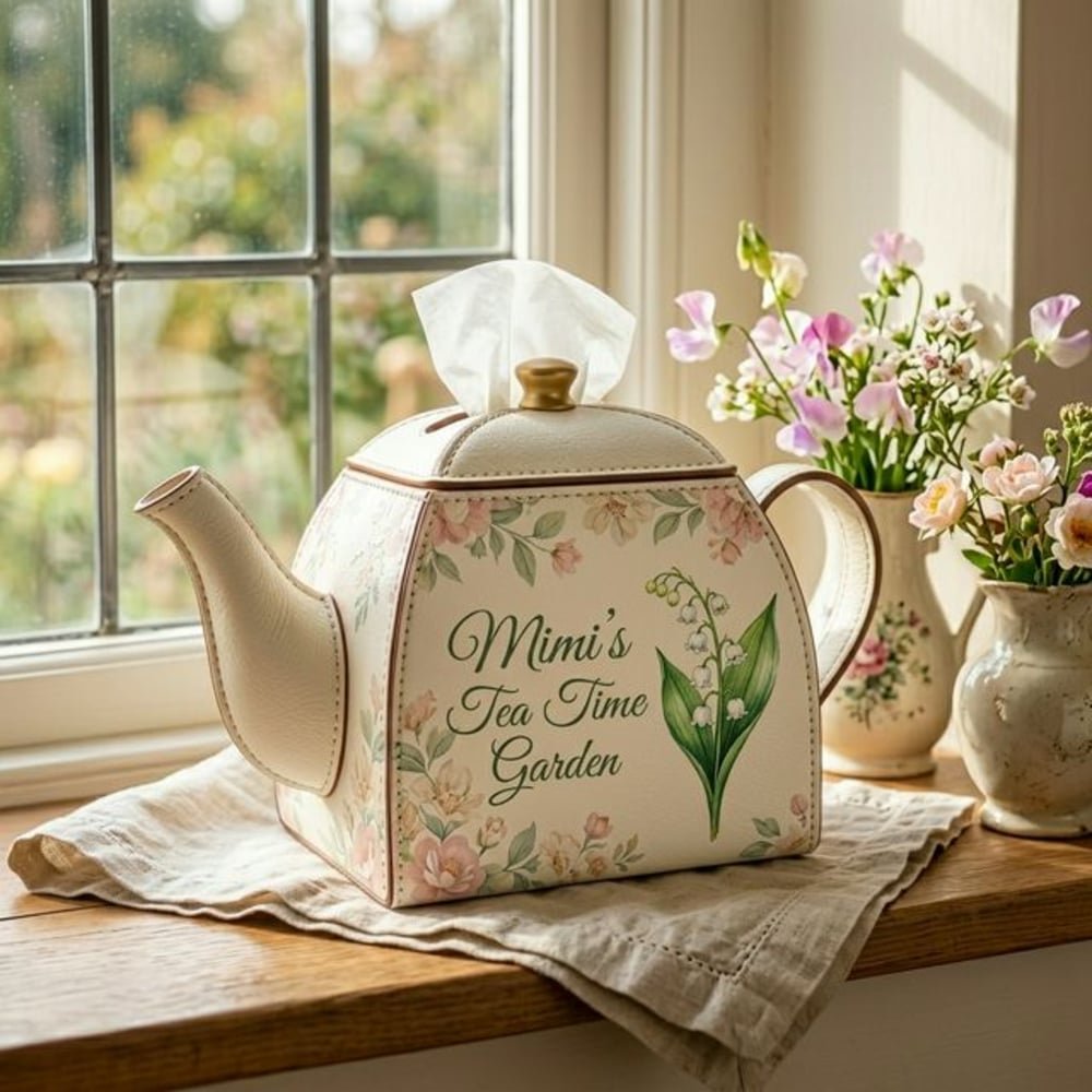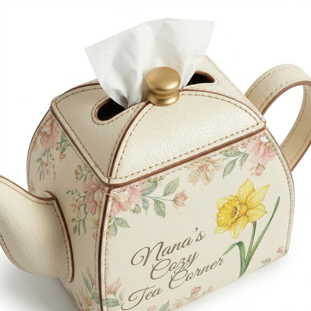 This elegant teapot-shaped leather tissue box cover features a timeless vintage floral pattern, beautifully accented with your choice of a vibrant birth flower and a custom name in artistic lettering. The charming teapot silhouette combined with rich texture and personalized detail makes it a true statement piece for any home.