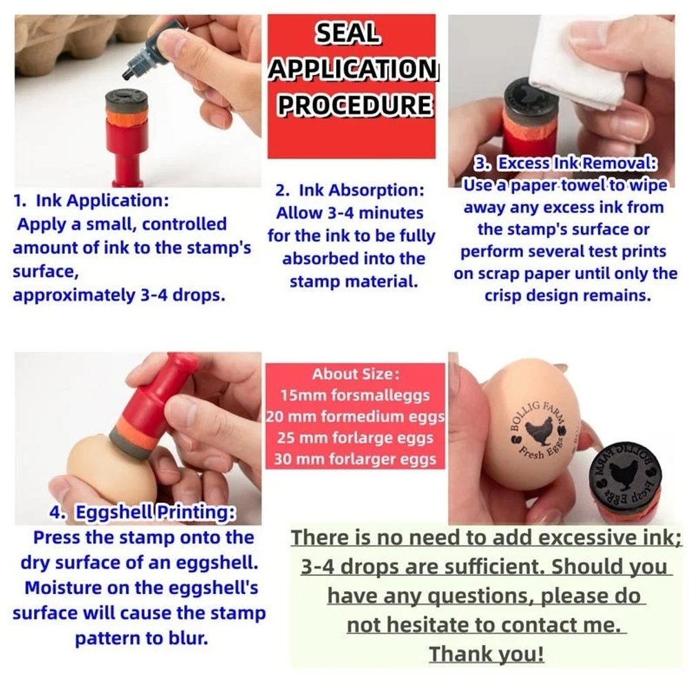 You just need to roll left and right when the egg is pressed, and then you can see A clear imprint is marked on the egg - Stamp description: 1: Apply the printing oil evenly in the seal where there are words, and then print face up to prohibit 2 minutes, wait for absorption. 2: If after 2 minutes, there is still printing oil on the surface,, use a paper towel to wipe away. 3: Clearly stamped, repeated use.