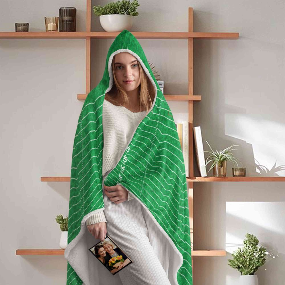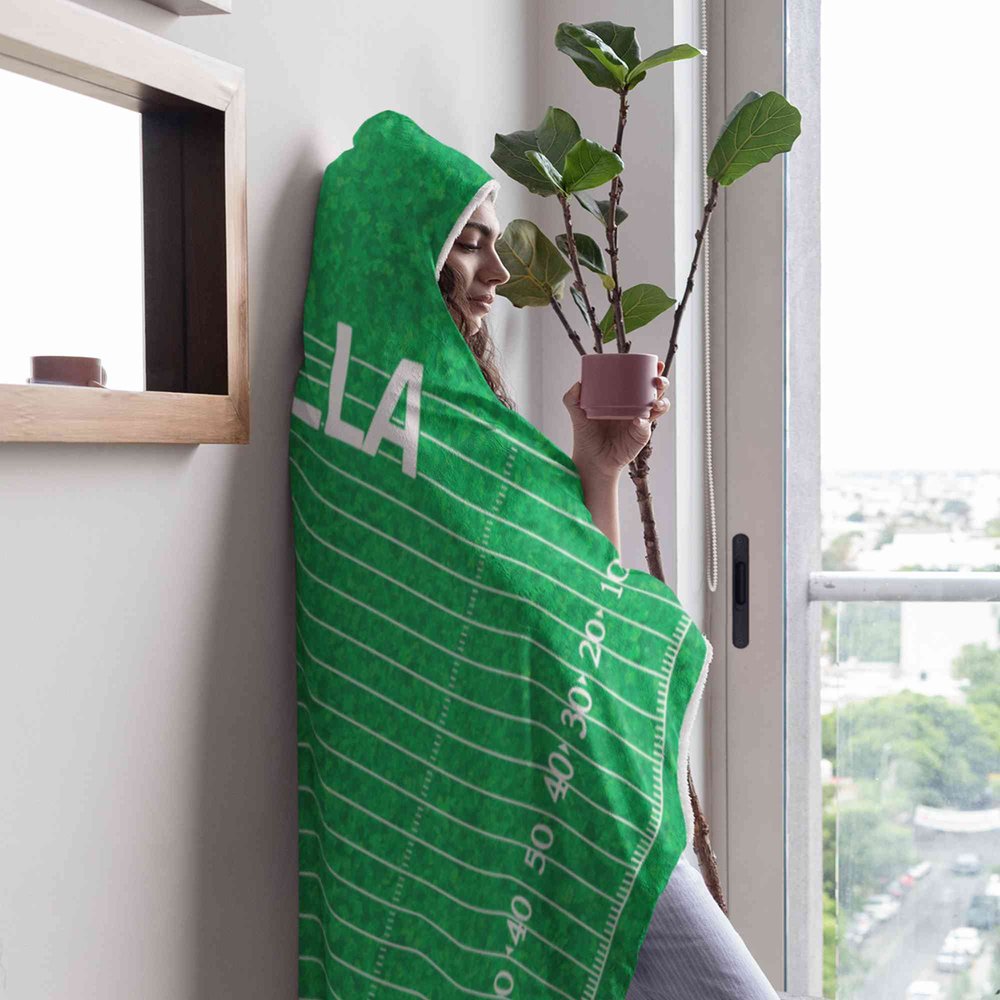 It blends sports fandom with cozy loungewear design. The full-coverage game field print, custom name, and plush hooded shape create a look that’s both a functional blanket and a proud expression of sports love — perfect for gifting, game nights, or casual relaxation.