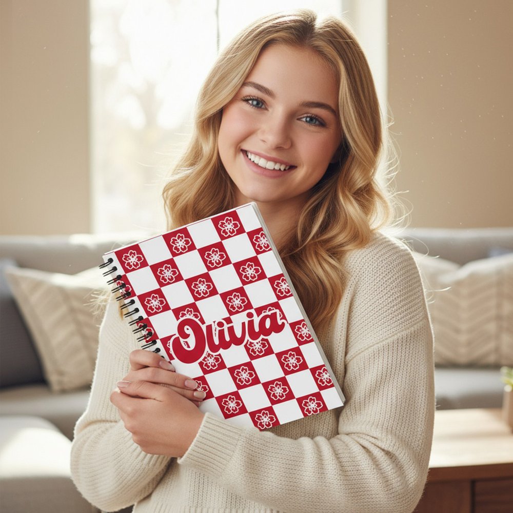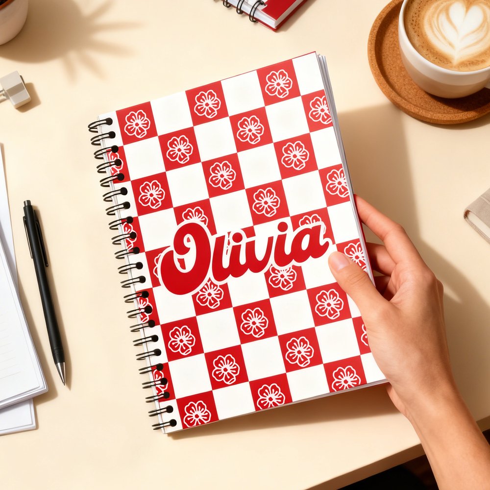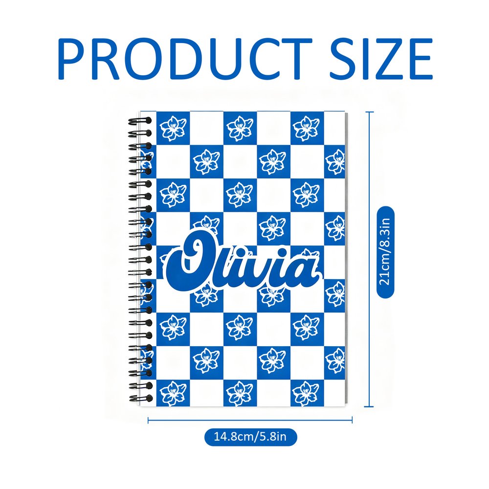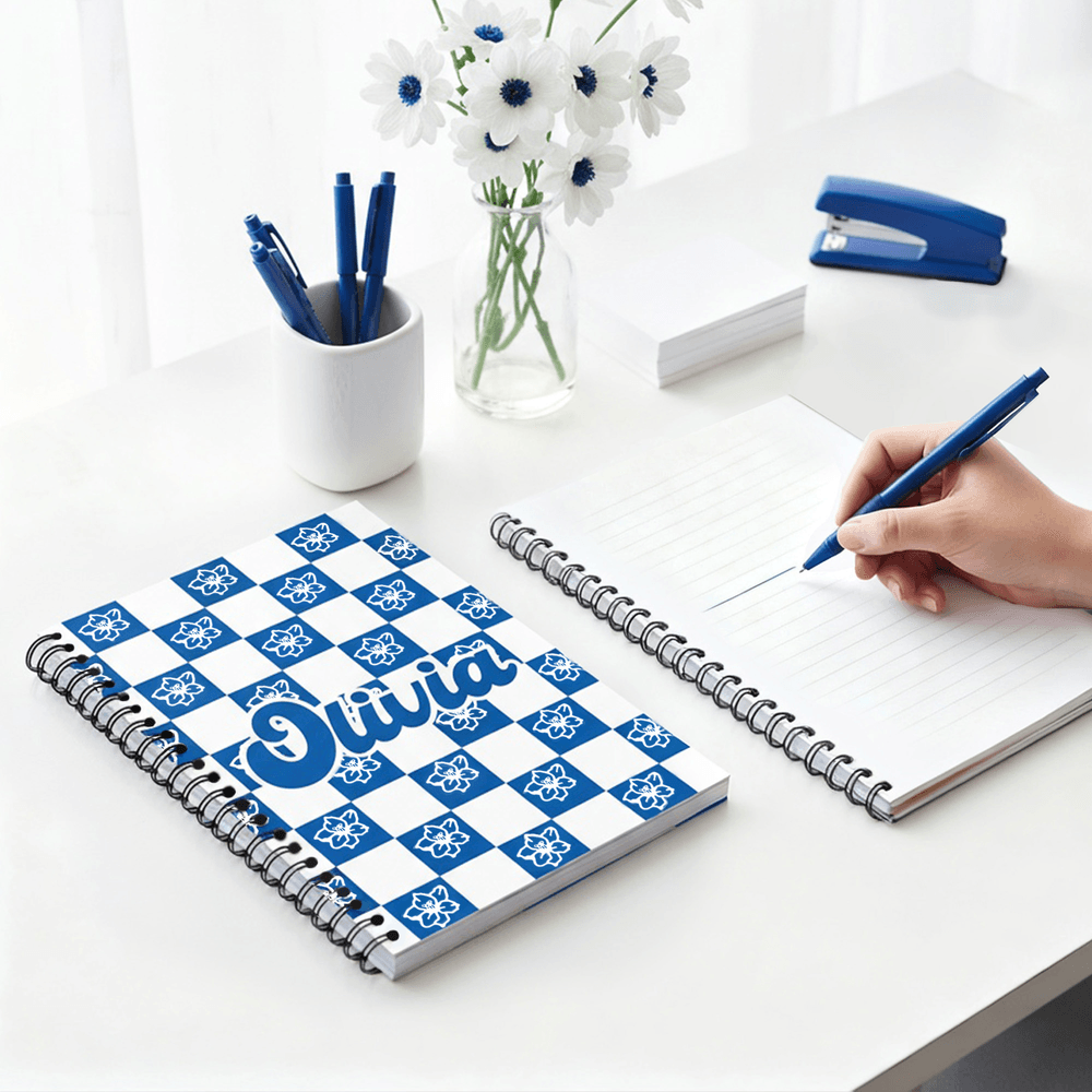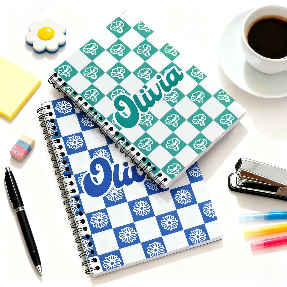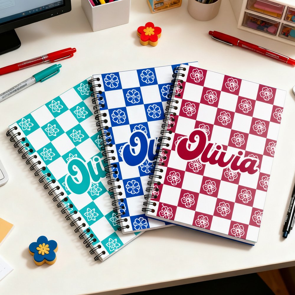 This notebook cover features a refreshing checkerboard pattern adorned with lively birth flower designs, paired with a customized name. The bright and soft colors create a romantic atmosphere and a sense of exclusivity, resulting in an elegant and refreshing style that makes the notebook a personalized item that combines aesthetics and heartfelt sentiment.