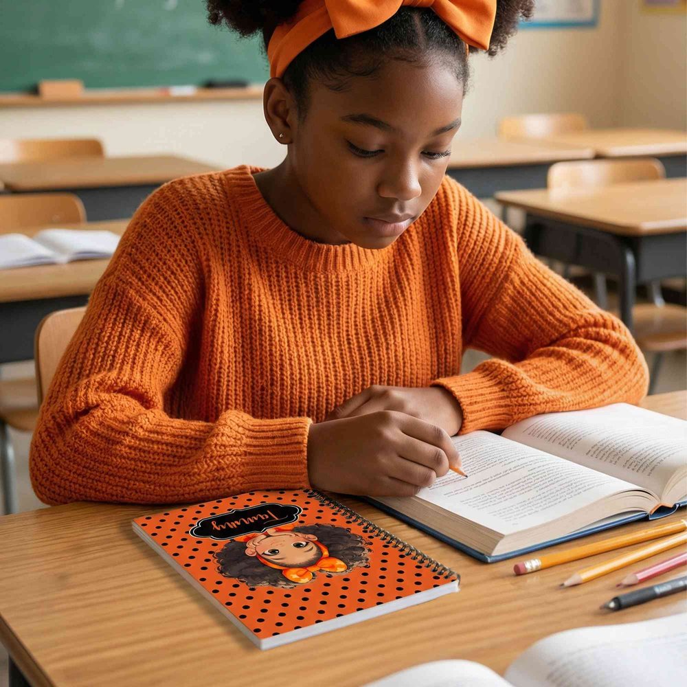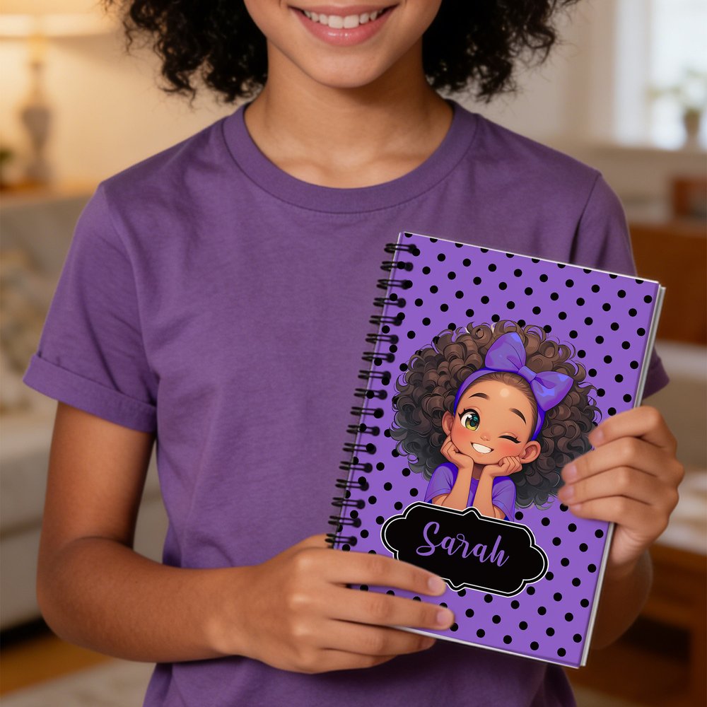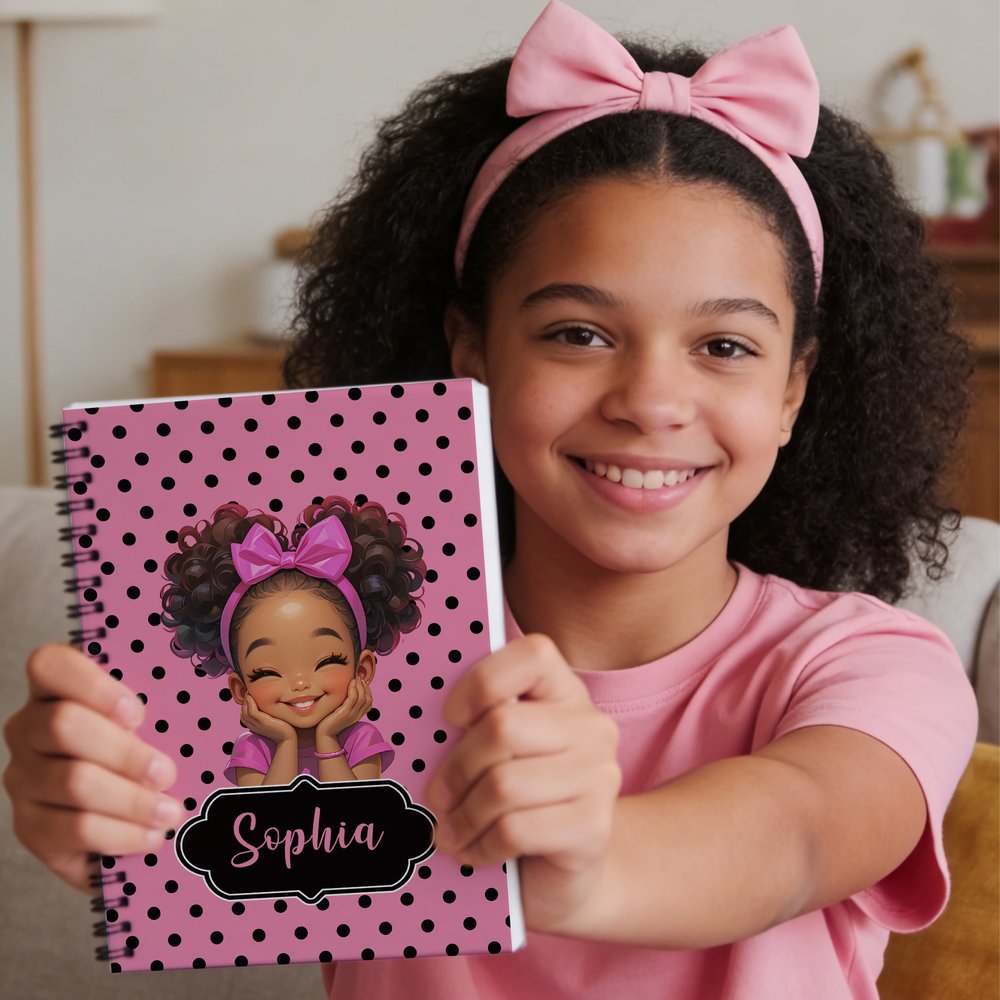 The cover features a cheerful cartoon Afro Black girl character with playful polka dots, celebrating confidence, diversity, and joy. The bright and friendly style feels fun, cute, and inspiring for everyday writing.