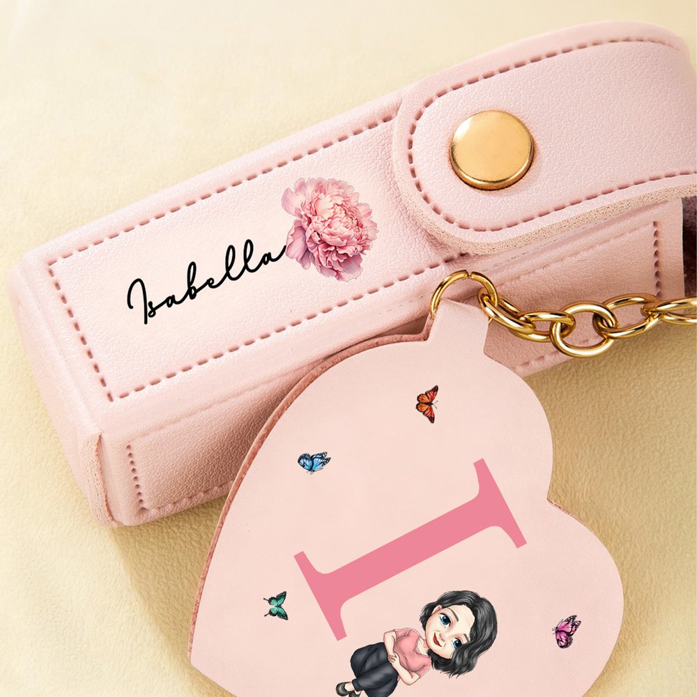 Personalized Cartoon Character Birth Flower Lipstick Case Keychain with Initial Name and Heart-Shaped Mirror Birthday Anniversary Gift for Women