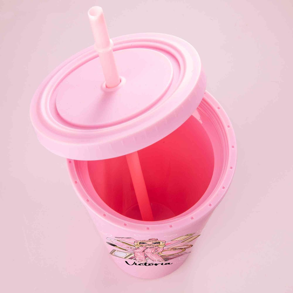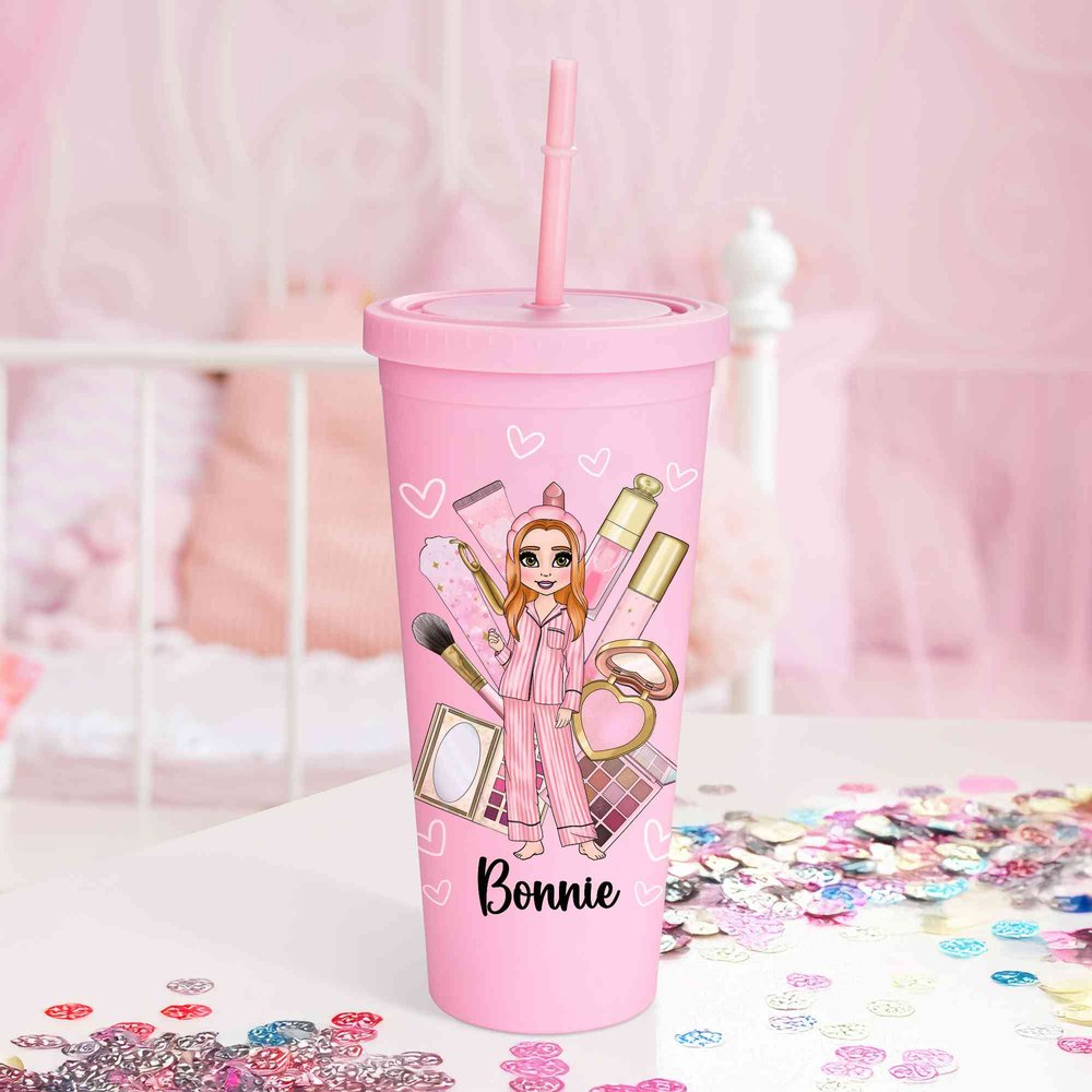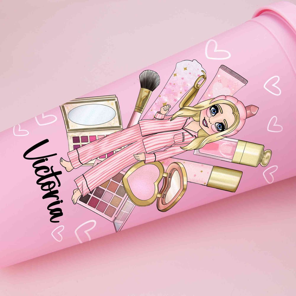 Featuring a girl in pajamas with makeup as the core element, the playful and cute image conveys a relaxed feeling, perfectly matching the casual atmosphere between sisters. The overall color scheme is a girly pink, and each sister can be customized with her own image and name, making the bottle more than just an ordinary utensil.