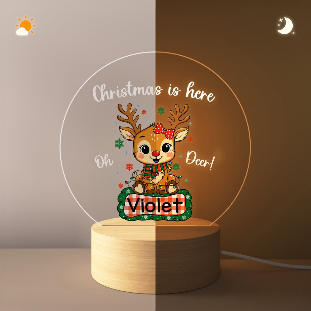Personalized Cute Christmas Deer LED Night Light with Wooden Base and Name Nursery Decor Birthday Holiday Gift for Kids