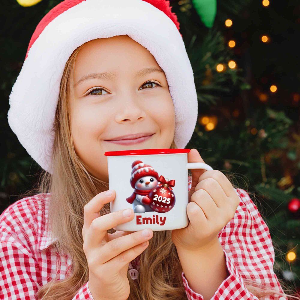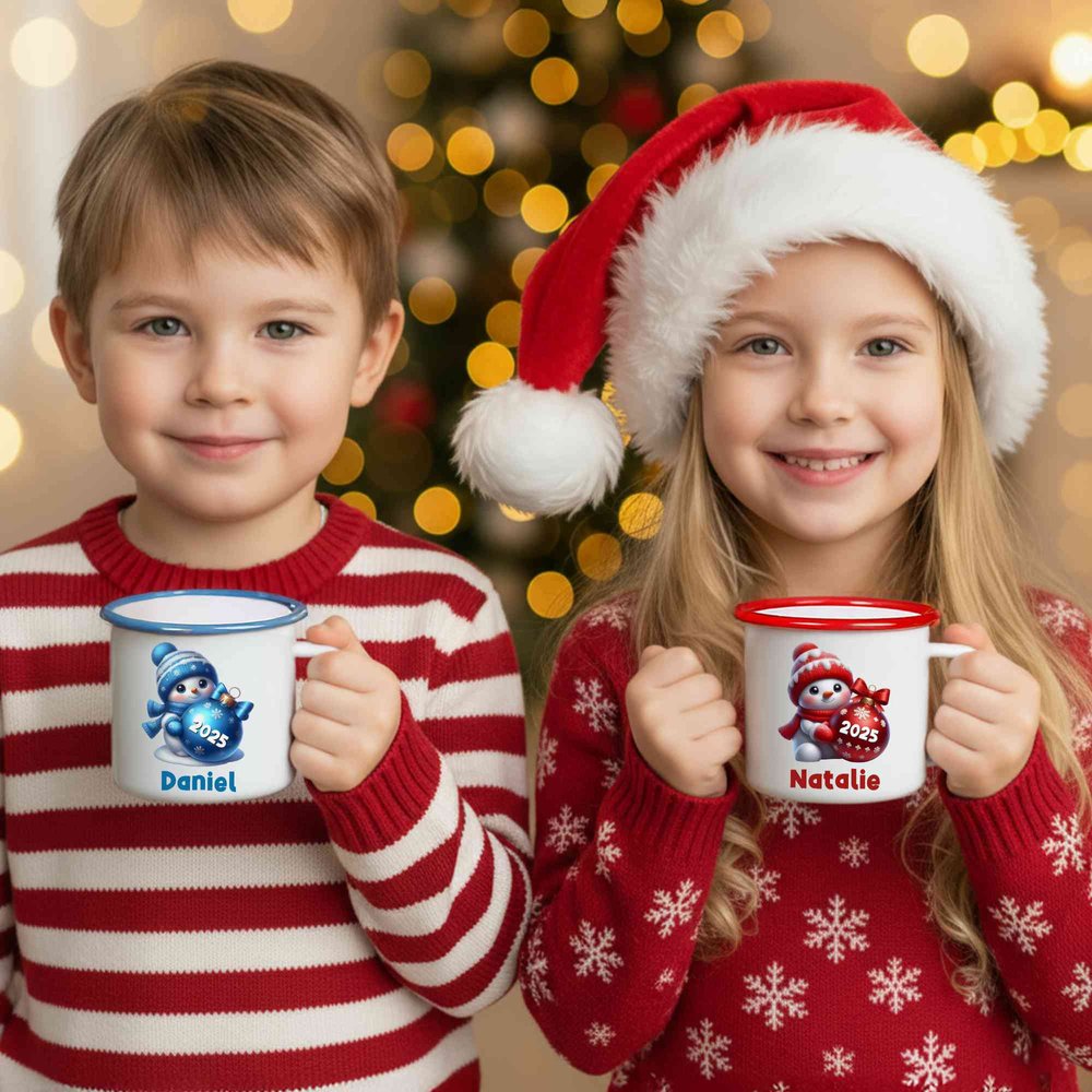 These mugs feature customizable, cute snowman designs, each with unique festive details like 2025 ornaments, scarves, or hats, paired with names. Choose from a range of colored rim accents, yellow, orange, red, etc., turning a classic enamel mug into a personalized Christmas keepsake that blends holiday charm with individual flair.