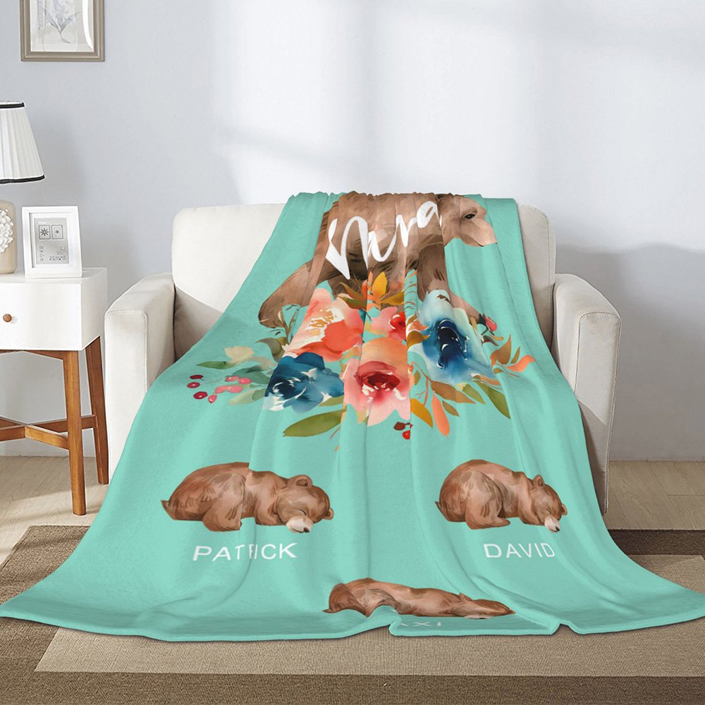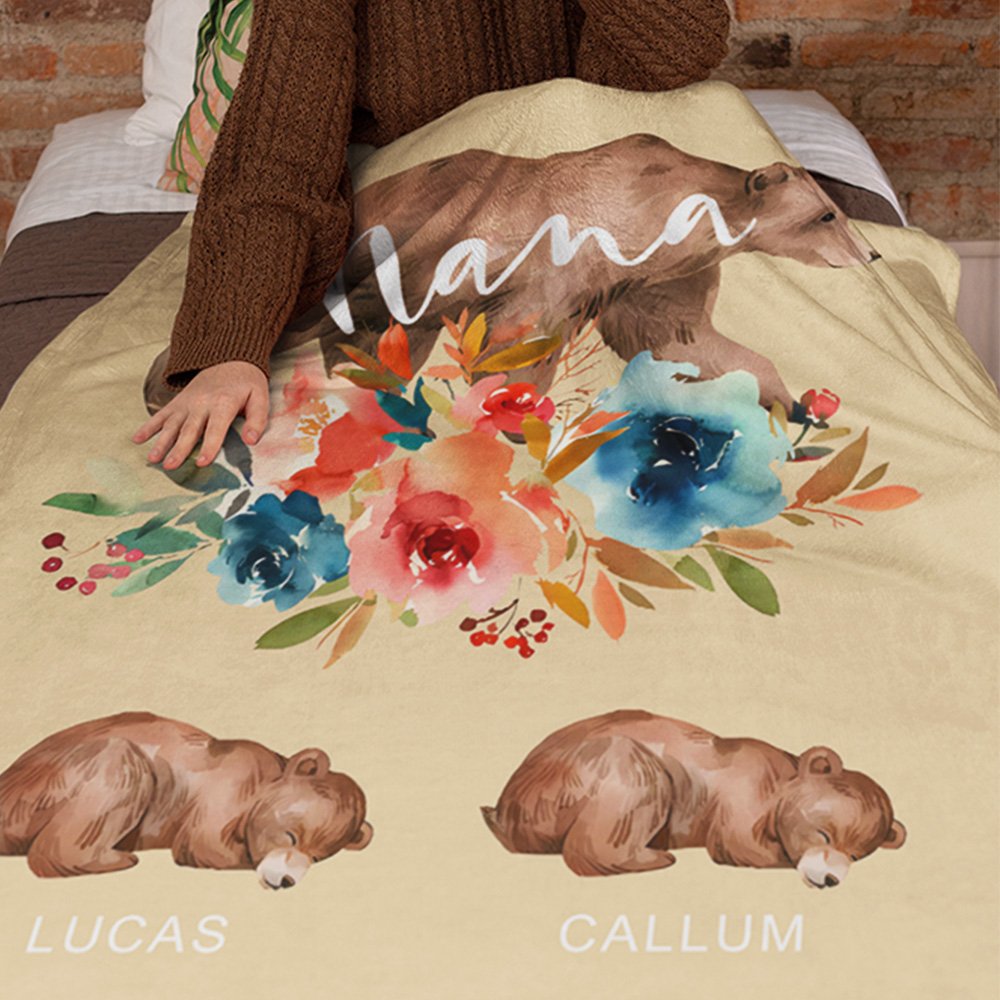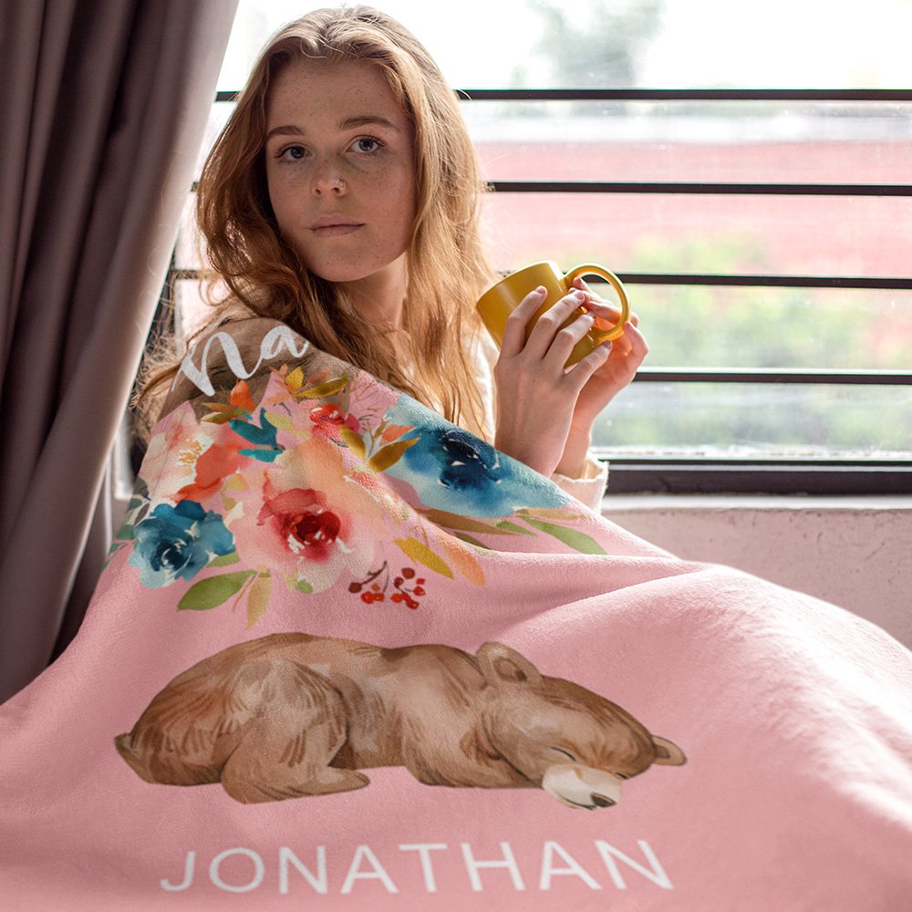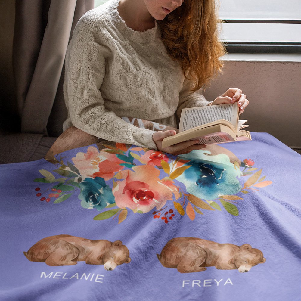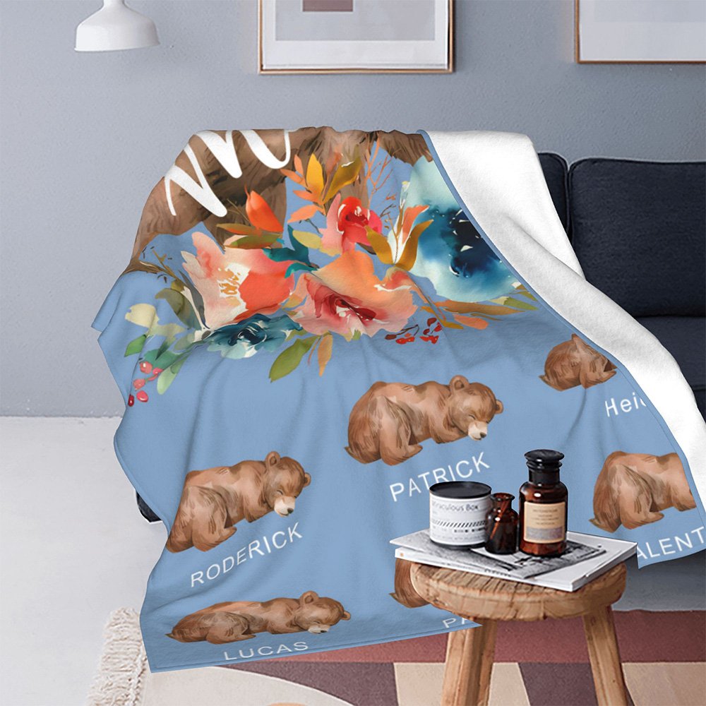 This blanket is designed in a watercolor style, featuring a cute mother bear and her children, with floral elements added. The mother bear is crawling, while the babies are sleeping peacefully. The picture is warm and intimate. You can personalize your name to create a unique home necessity.