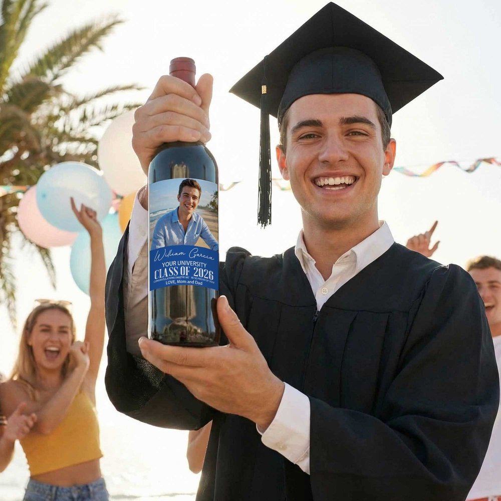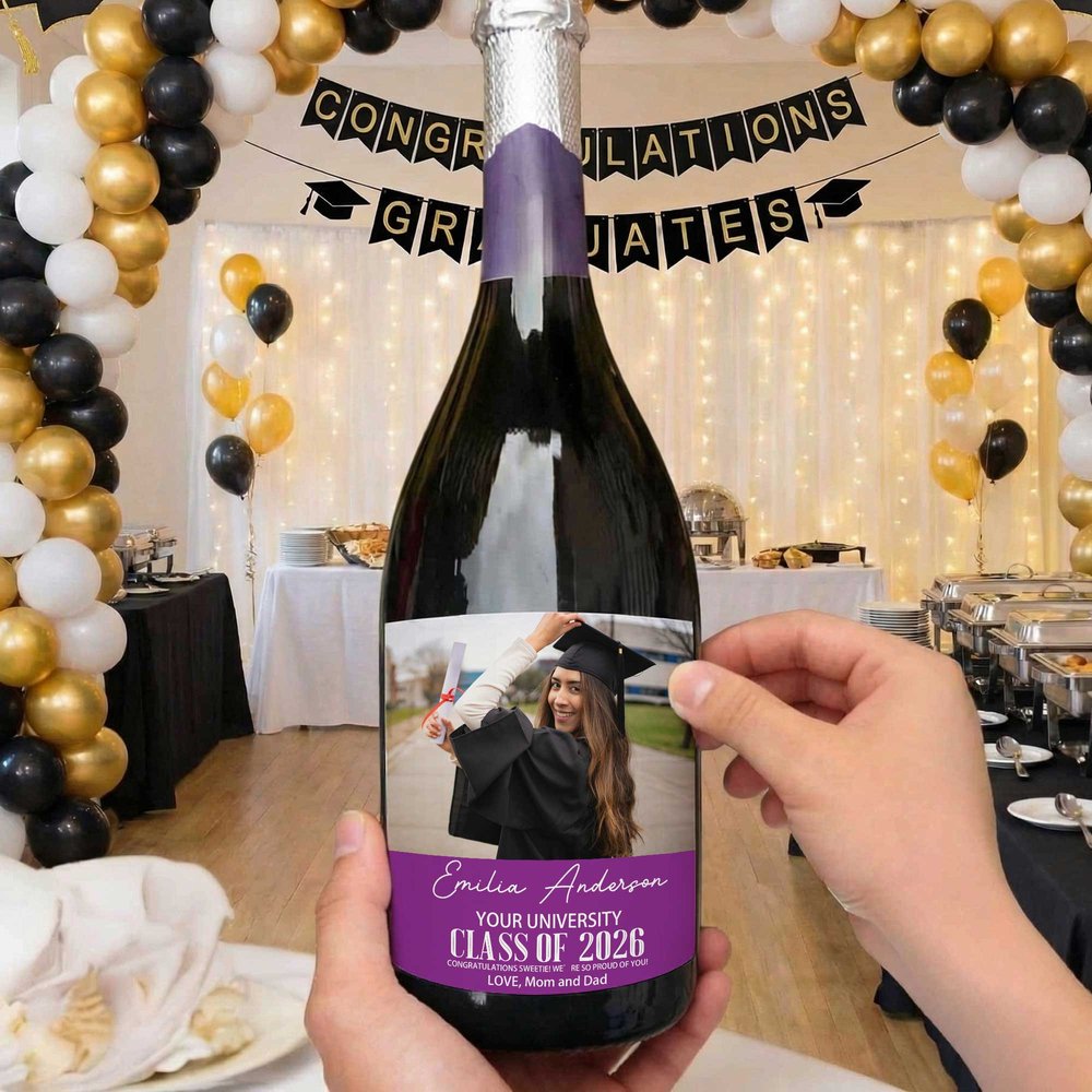 Centered on graduate photos, names, school names, and graduation year, the design is simple yet commemorative, incorporating unique youthful memories into the stickers. This instantly transforms an ordinary wine bottle into a one-of-a-kind graduation souvenir.
