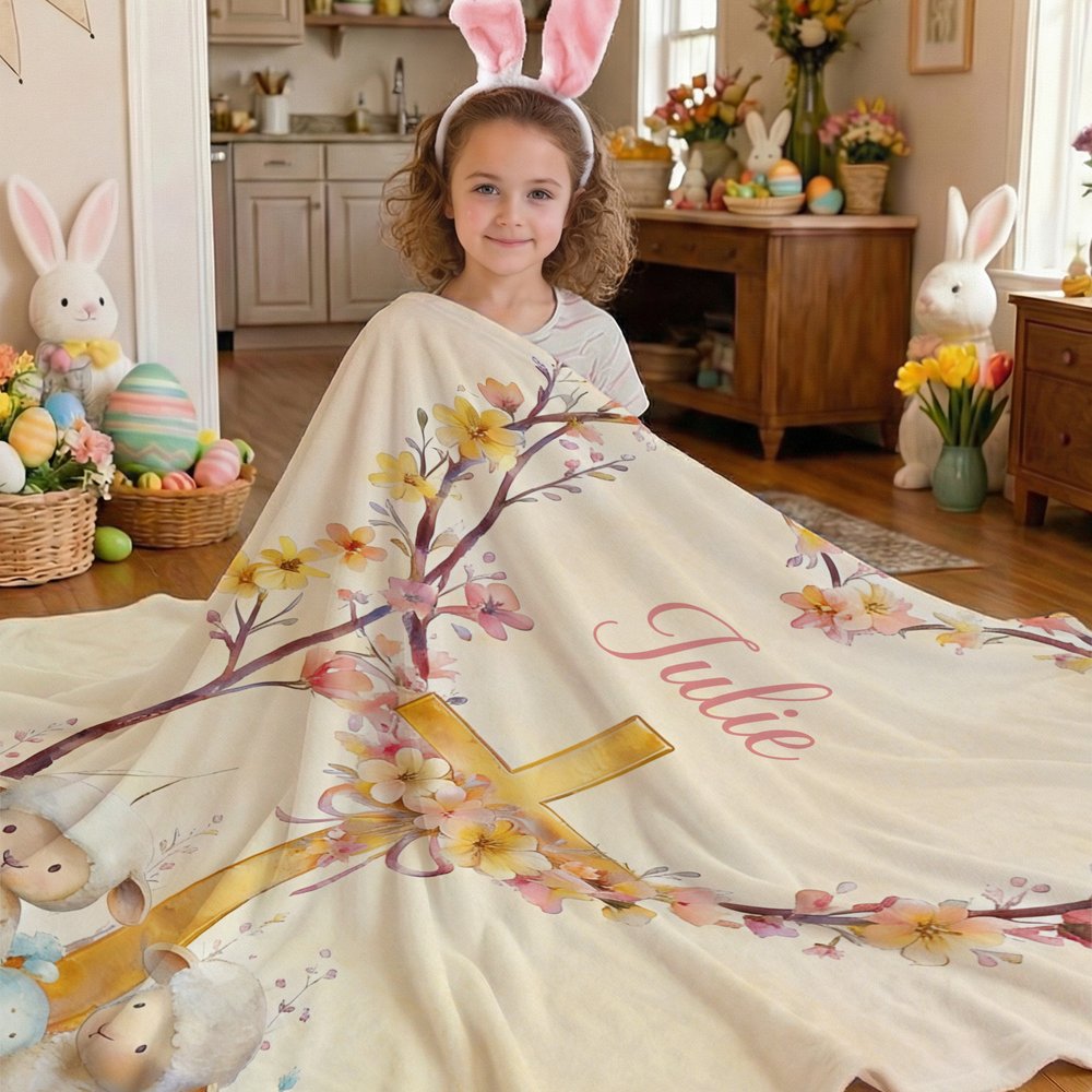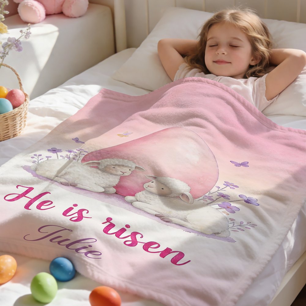 Personalized He Is Risen Cross Sheep Soft Throw Blanket with Name Home Decor Egg Hunting Easter Gift for Kids