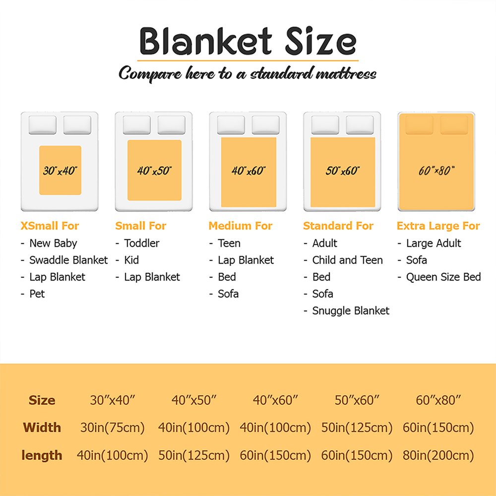 Measurement: Fleece Blanket - 30" × 40"(75cm × 100cm), 40" × 50"(100cm × 125cm), 40" × 60"(100cm × 150cm), 50" × 60"(125cm × 150cm), 60" × 80"(150cm × 200cm), Sherpa Blanket - 40" × 50"(100cm × 125cm), 50" × 60"(125cm × 150cm), 60" × 80"(150cm × 200cm)
