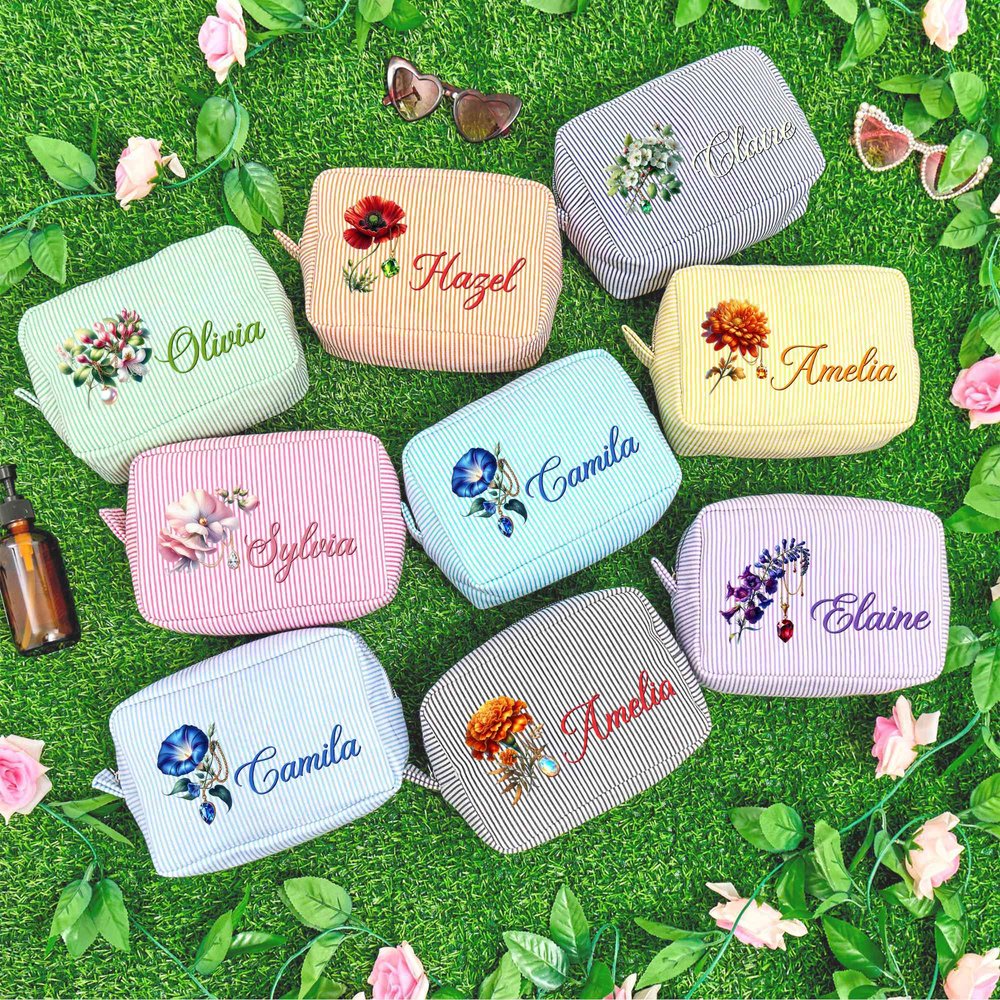 Personalized Retro Gemstone Birth Flower Stripe Large Capacity Makeup Bag with Name Travel Essentials Bridesmaid Birthday Gift for Women