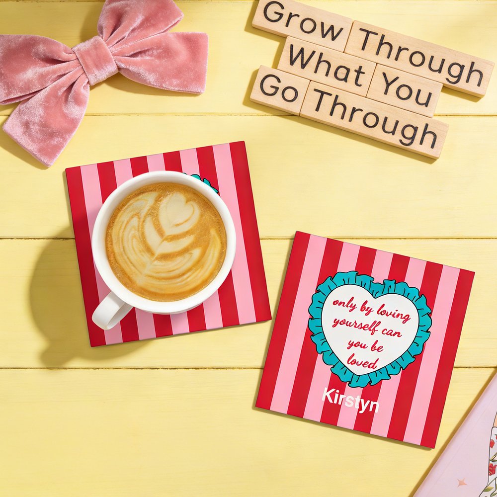 Incorporating striped heart elements, paired with the words "Self Love" and a customized name, the style is simple and soothing. A matching coaster is also included, showcasing a unique and gentle style that appeals to women's aesthetic preferences.