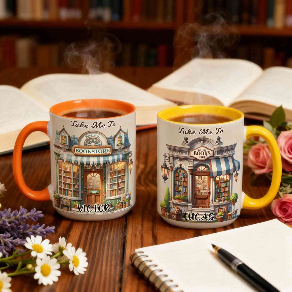 This mug features a beautiful bookstore theme, incorporating elements like vintage bookshelves and artistic window displays, along with the signature "Take Me To" text, instantly appealing to book lovers! It supports personalized name customization and comes in a variety of colors, allowing you to create a unique, personalized item. A matching coaster is also available for a perfect match, enhancing both the user experience and the decorative appeal.